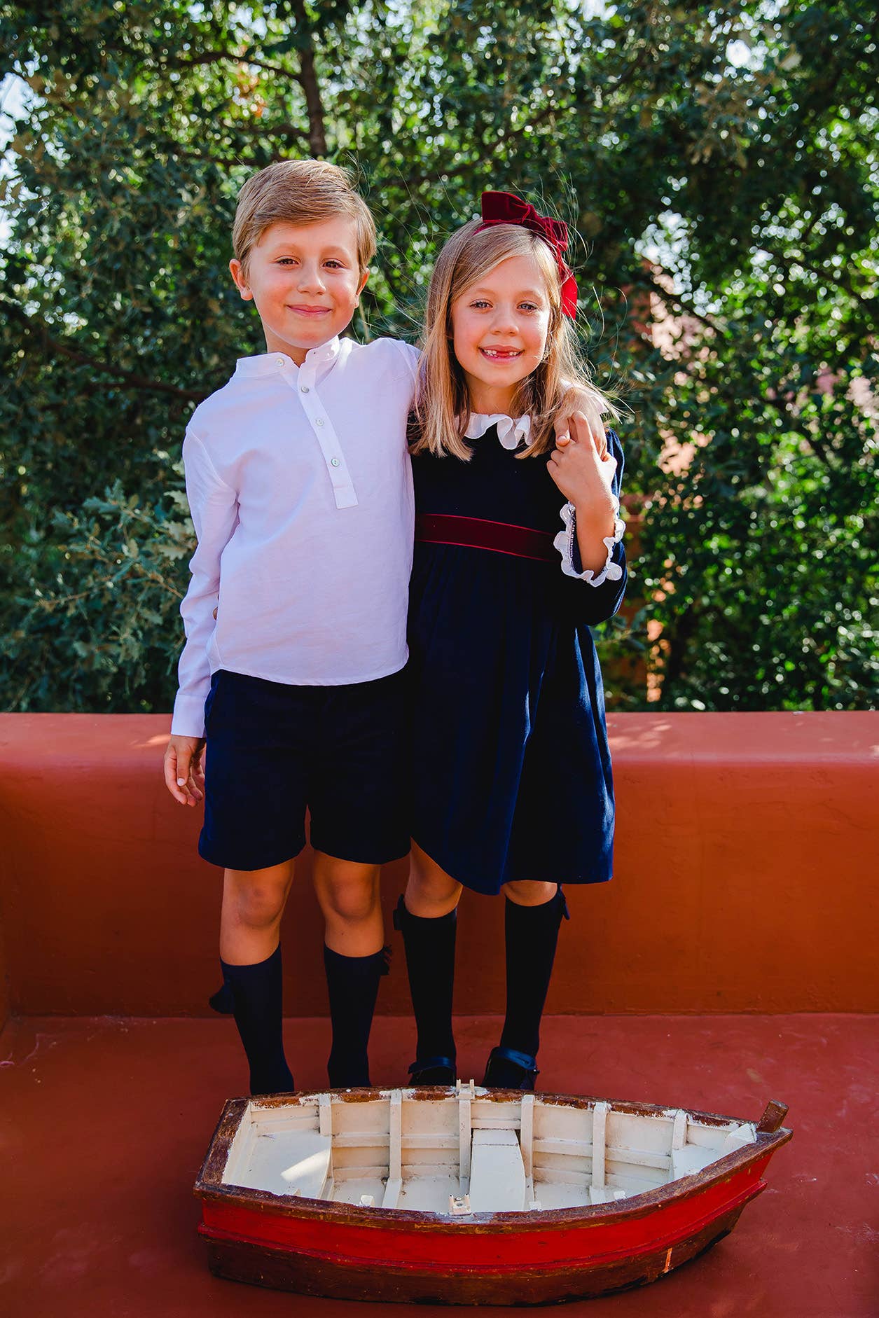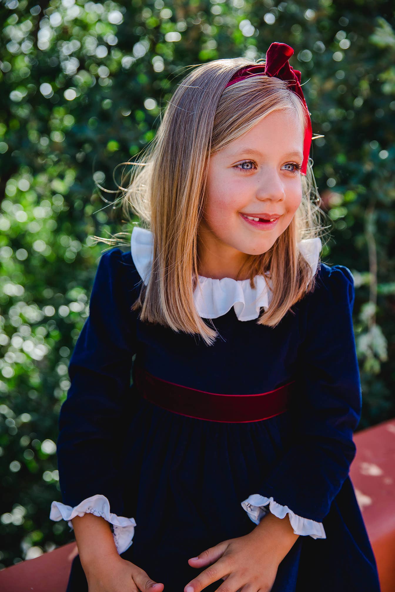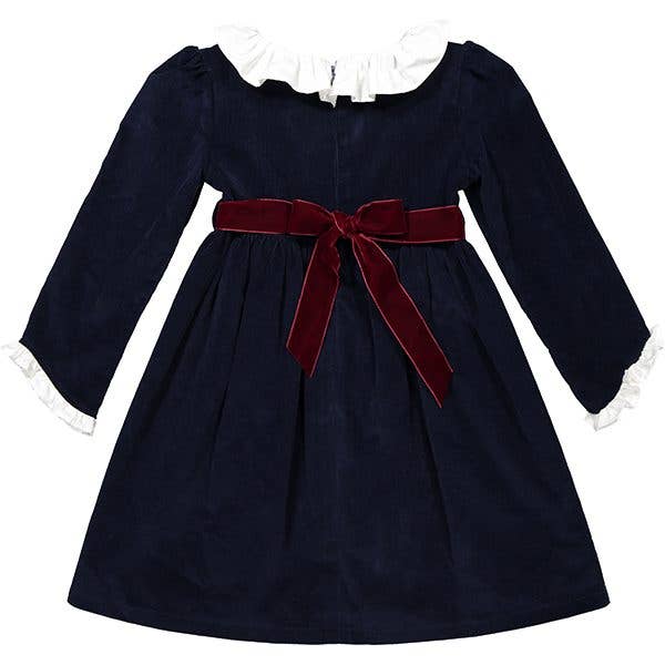 Classic. Traditional. Elegant. This rich navy-blue corduroy piece exudes timeless sophistication, adorned with hand-applied frill details on the collar and sleeves for a delicate Victorian-inspired touch. The look is completed with a luxurious Bordeaux velvet belt tied into a graceful bow at the back, adding a regal finish.