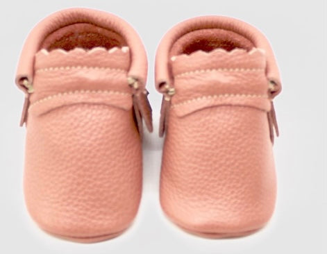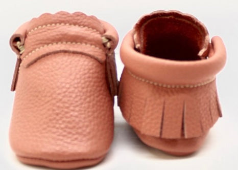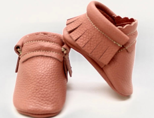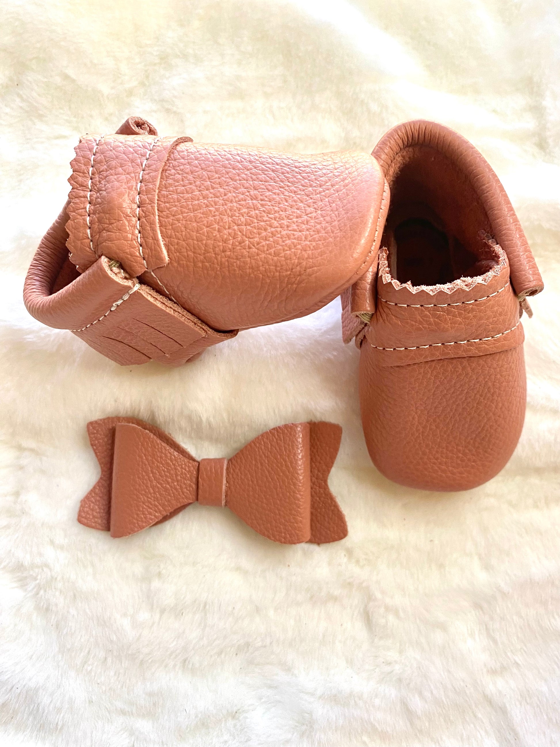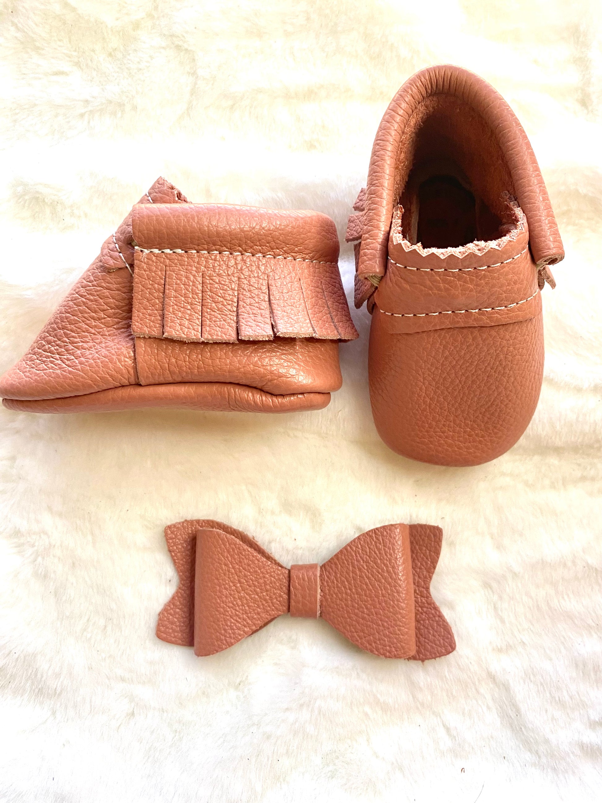 Handmade moccasins are sewn in Ohio from start to finish. Made of real leather and great for beginner walkers. Has coordination bow tie that is sold separately.